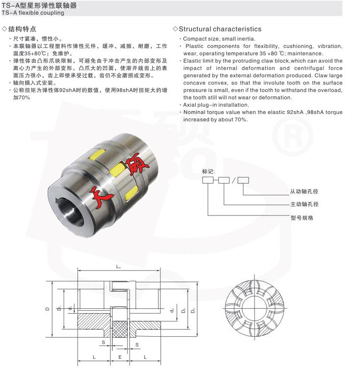 3.與其它聯軸器相比,星形彈性聯軸器具有以下特點: