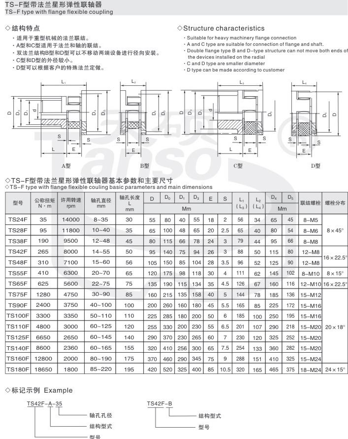 星形彈性聯軸器是利用星形彈性元件置于兩半聯軸器凸爪之間以實現現半聯軸器的彈性聯接,結構特點尺寸緊湊慣性小,以工程塑料作彈性元件,適用于聯接兩同軸線的傳動軸系,具有補償兩軸相對偏移、緩沖、減震、耐磨性能,不用潤滑,可以在有粉塵和水份的條件下工作,結構簡單,維修方便,但更換彈性元件時需移動一端半聯軸器和主機軸。適應場合普遍,傳遞轉矩20-35000.N.M,工作溫度-35-+80攝氏度并與德國ROTEX聯軸器互換。聚氨脂彈性體由凸形爪塊限制,可避免由于沖擊產生的內部變形及離心力產生的外部變形;凸爪大的凹面,使漸開線齒上的表面壓力很小,齒上即使承受過載,齒仍不會磨損或變形。具有補償兩軸相對偏移、減振、緩沖、徑向尺寸小、承載能力較高、維護方便等特點,但更換彈性元件時兩半聯軸器需沿軸向移動。適用于聯接兩同軸線、起動頻繁、正反轉變化、中低速、中小功率傳動軸系、要求工作可靠性高的工作部位,不適用于重載及軸向尺寸受限制、更換彈性元件后兩軸線對中困難的部位。